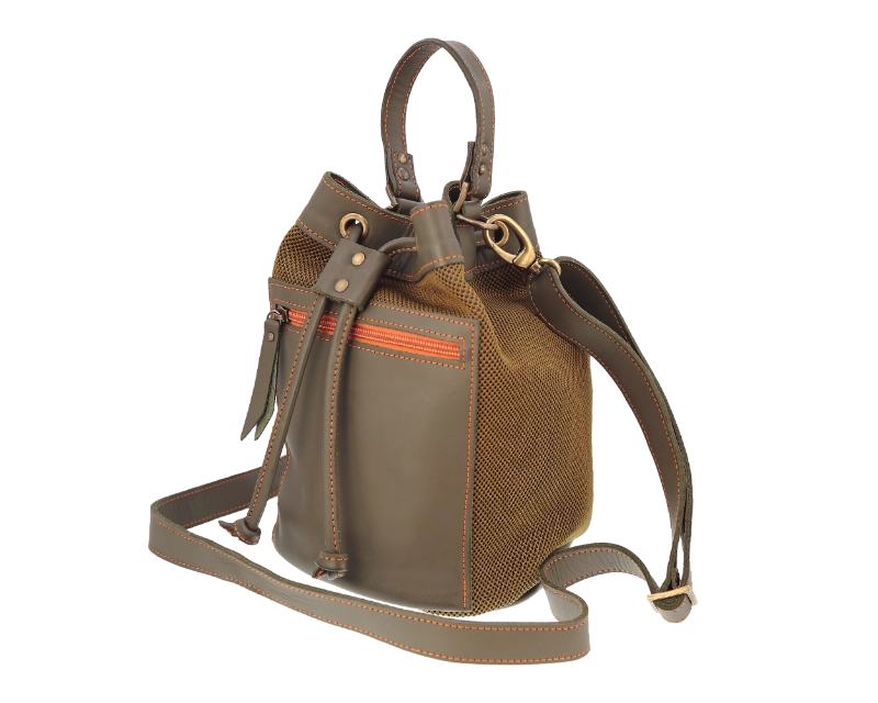 Bolso mediano textil-piel con bolsillo exterior con cremallera. Se puede llevar de mano o como bandolera.
