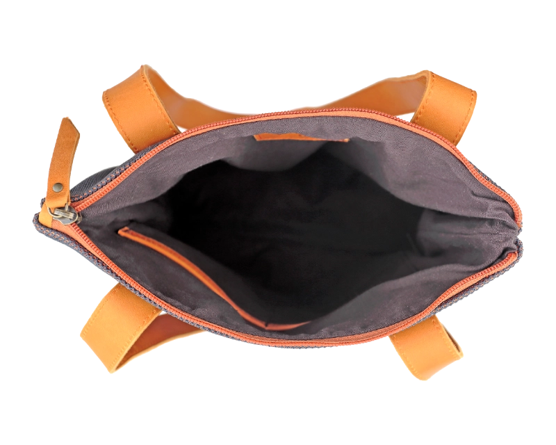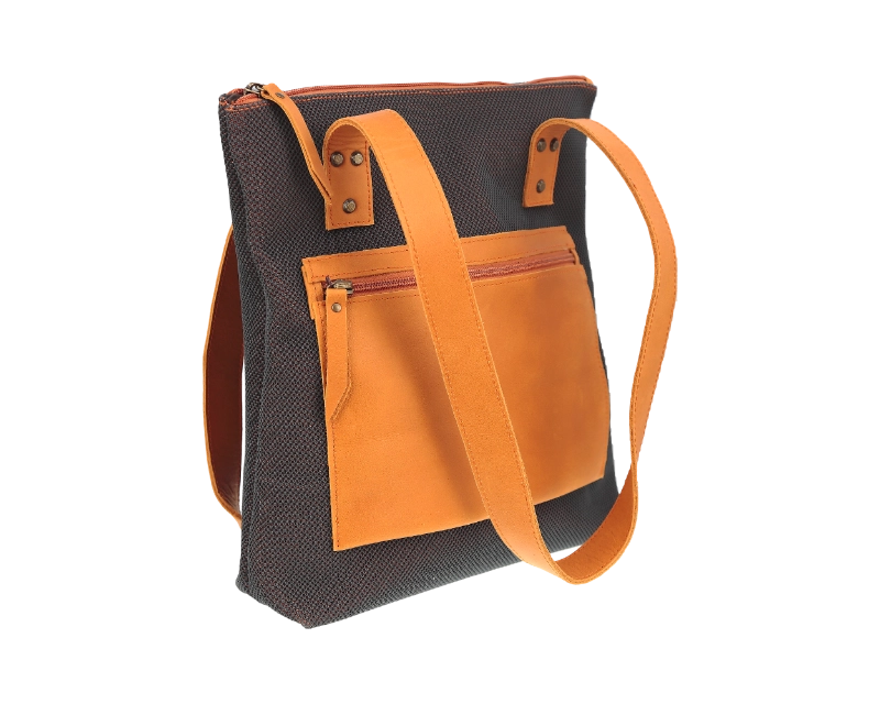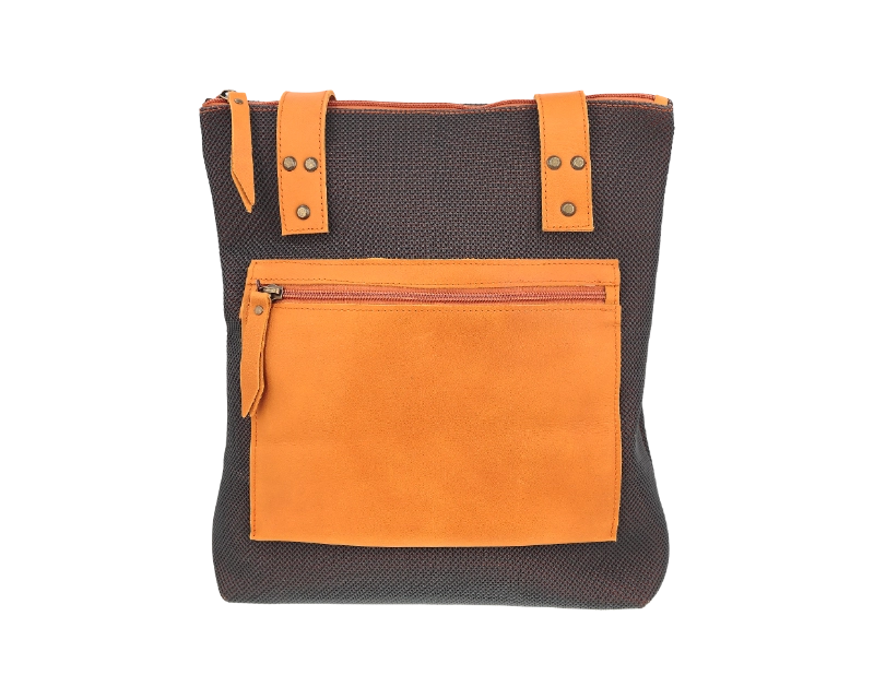 Bolso mano hombro textil-piel con bolsillo exterior con cremallera, interior confeccionado con tejido algodón y compartimento para móvil.