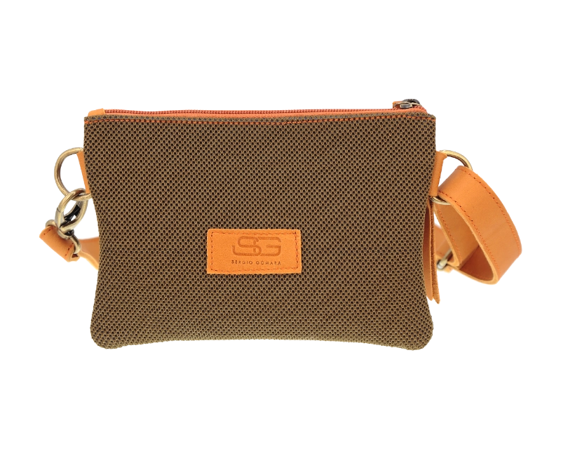Riñonera mediana textil-piel con bolsillo exterior con cremallera. Se puede llevar como bolso bandolera ya que dispone la correa un sistema de mosquetones.